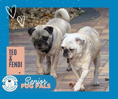 The photo you see here features Teo (10) and Fendi (15), two of our Senior Pug Pals. Both are blind, have limited hearing, and carry a few extra medical challenges. The good news? They are comfortable, confident, and surrounded by love. They have wonderful foster families, each other, and a rescue community that makes their care possible.